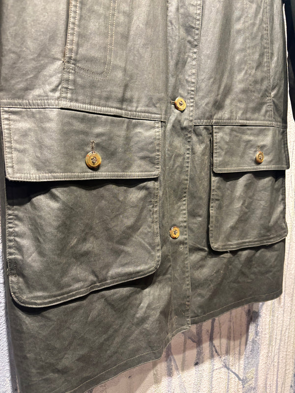 vintage waxed rain parka, good shape with removable flannel vest, full zip with button closures. Some discoloration that would most likely wash off!